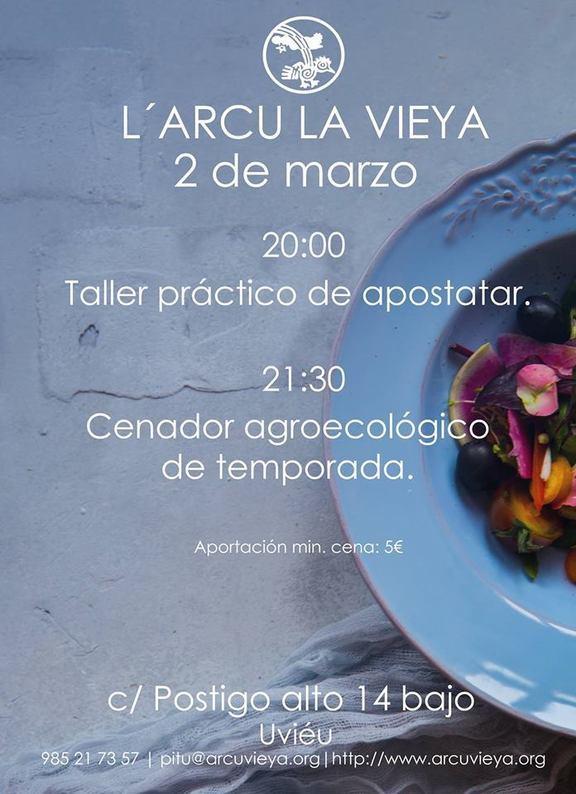 Taller práctico de apostatar. 20h. Cenador agroecológico de temporada. 21.30h. Aportación min. cena: 5€.