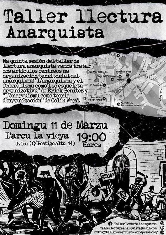 Na quinta sesión del taller de llectura anarquista vamos tratar dos articulos centraos na organización territorial del anarquismu: "L'anarquismu y el federalismu como'l so esqueletu organizativu" de Erick Benítez y "L'anarquismu como teoría d'organización" de Colin Ward.