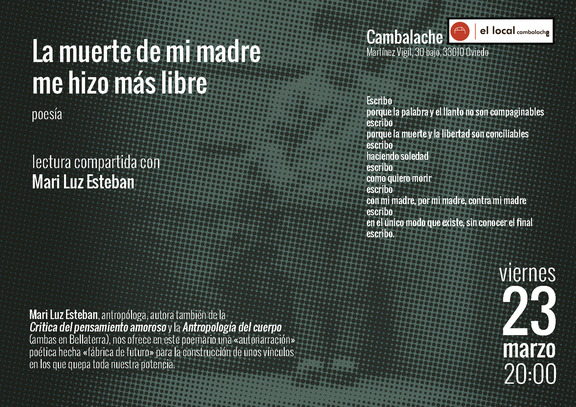 El viernes 23 de marzo a las 20h Presentación del poemario La muerte de mi madre me hizo más libre. Lectura compartida con Mari Luz Esteban (autora).