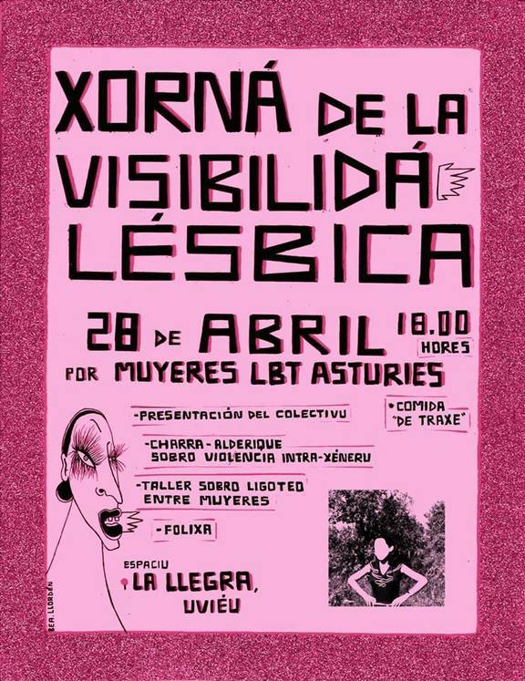 Este jueves 26 es el día de la visibilidad lésbica. Por ello, el sábado 28 el colectivo de Muyeres LBT Asturies hemos organizado una jornada con actividades que se realizarán en el Espaciu La Llegra, Oviedo, a las 18h. Mientras tanto habrá "comida de traxe", cada une, si le apetece, puede aportar lo que quiera.