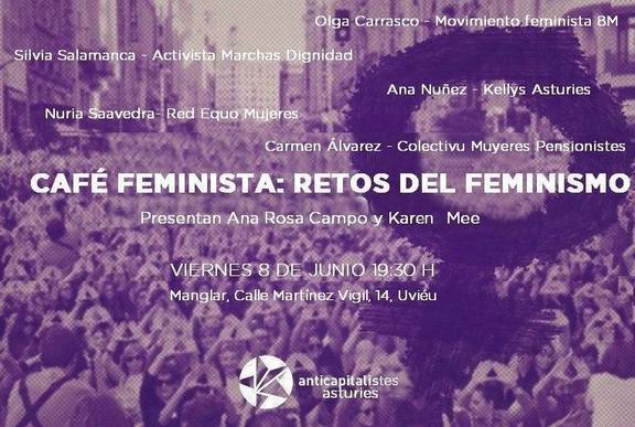 El viernes 8 de junio a las 19:30 h, en el Manglar, comparte y debate con nosotras, con las compañeras del movimiento feminista y de colectivos en lucha de muyeres, sobre los retos del feminismo. No te pierdas el Café feminista de Anticapi Asturies!!