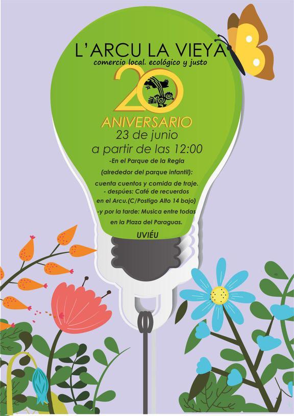 El sábado 23 de junio celebraremos el 20 aniversario del arcu. Por la mañana, a partir de las 12, estaremos en el parque debajo del arcu con el cuentacuentos de "Zeina - una leyenda bereber". La idea es luego comer de traje en los praos alrededor del parque infantil. El café lo tomaremos en el arcu, recordando un poco los últimos 20 años. La tarde la pasaremos en buena compañía con música compartida y autogestionada en la Plaza del Paraguas. Trae tu gitarra, canción favorita y amigines! Nos vemos el 23 de junio.