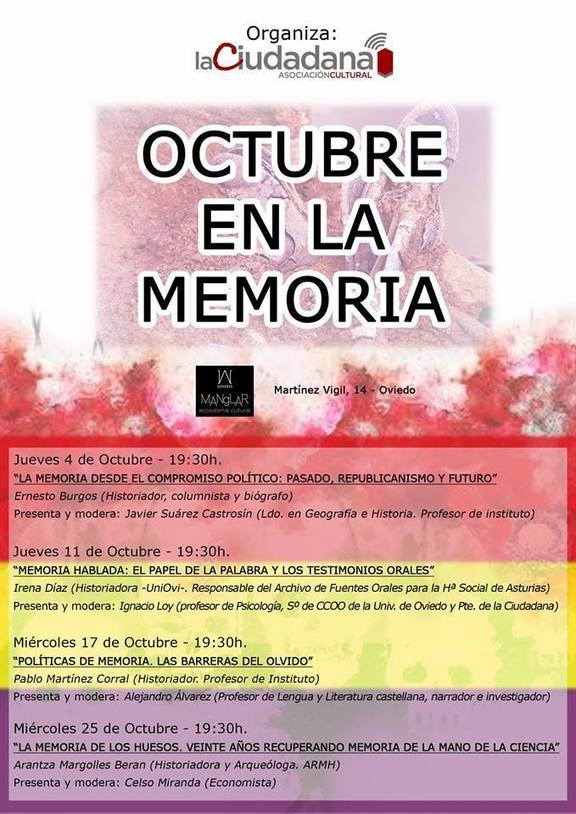 Octubre, el mes de la memoria. La Asociación Cultural La Ciudadana organiza un ciclo de charlas sobre el papel de la Memoria Histórica desde distintos puntos de vista: el político, el de la actualidad, el de la investigación histórica y aquel que atañe al proceso de recuperación de los restos de las víctimas. Jueves 4,11 y 25 y miércoles 17 de octubre, a las 19,30h, en El Manglar.