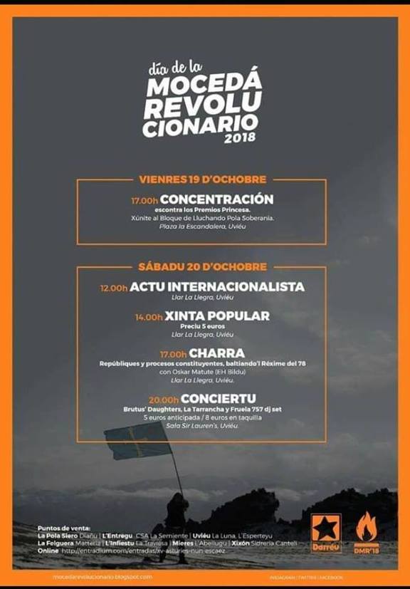 Dientro les actividaes del DMR 2018, cuntaremos con una charra'l sábadu 20 dende les 17:00 nel Espaciu La Llegra. Va tar a cargu d'Oskar Matute, anguaño diputáu d'EH Bildu nel Congresu. Va falanos alrodiu "Repúbliques y procesos constituyentes, baltiando'l réxime del 78", poniendo l'acentu nel protagonismu de los pueblos pa frayar esti réxime inxustu que carecemos, y que n'Asturies traduzse ente otres coses na emigración masiva de la mocedá pola falta d'un futuru dignu. ¡Esperámosvos!