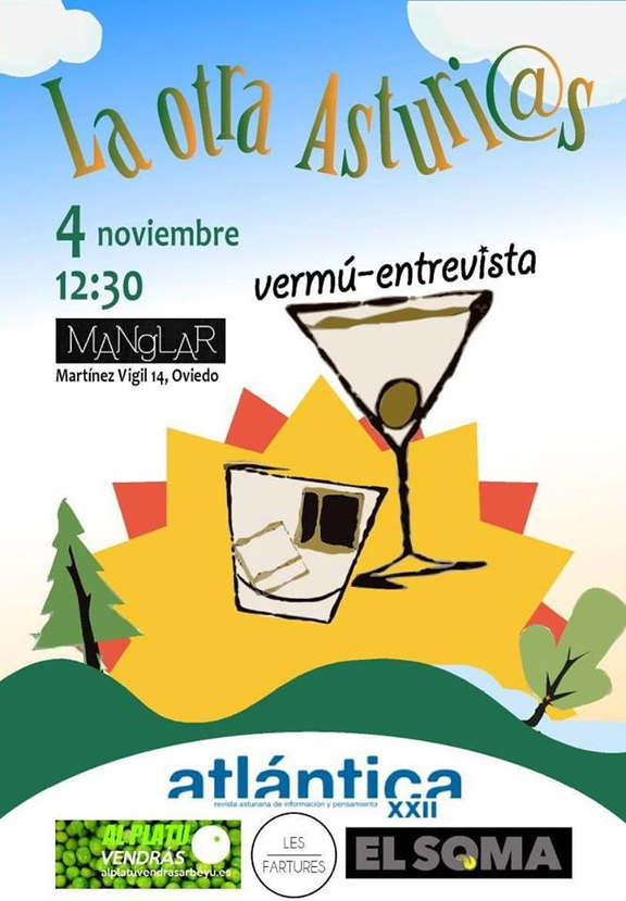 Este domingo organizamos nuestro primer VERMÚ-ENTREVISTA, donde hablaremos de esa otra Asturias que se hace en internet a través de sus mejores webs no institucionales. En este primer encuentro nos juntaremos los responsables de ATLÁNTICA XXII, AL PLATU VENDRÁS, EL SOMA y LES FARTURES. La entrada es gratuita, así como la participación. Un vermú informal para hablar entre risas de nuestra tierra.