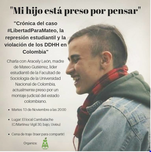 El martes 13, a las 20 hrs., Aracely León Medina nos contará acerca de su hijo Mateo Gutiérrez León, estudiante de Sociología de la Universidad Nacional de Colombia, acusado falsamente de atentados terroristas que no cometió y por los que se encuentra actualmente preso.