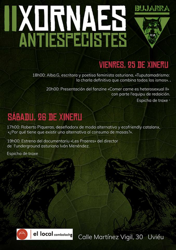 Otro año más, esta vez junto con el colectivo Cambalache -el local-, organizamos unas jornadas con el fin de difundir por medio de charlas, talleres, debates etc, así como con la presentación de un fancine, el mensaje antiespecista en Asturias.