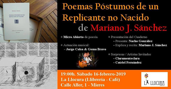 - Presentación de "Poemas Póstumos de un Replicante no Nacido" de Mariano J Sánchez a cargo del gran Nacho González. Explicación y lectura de poemas del cuaderno.