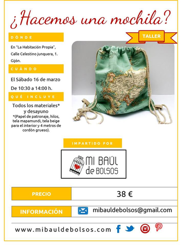 Esta vez haremos una mochila con la tela mapamundi en "La Habitación Propia" (C/ Celestino Junquera, nº1, Gijón). Una preciosa cafetería-librería femenina, en la que pasarás una mañana entretenida, descubrirás técnicas de costura y conocerás a personas con tus mismas aficiones en un ambiente divertido y café en mano.