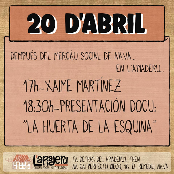 ¡Acutái'l 20 d'abril qu'en Nava hai plan! Musiquina del país, proyección del docu "La huerta de la esquina" y coloquiu coles creadores.