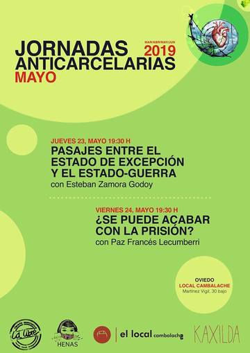El jueves 23 de mayo a las 19.30h. Presentación del libro Pasajes entre el estado de excepción y el estado-guerra, con Esteban Zamora Godoy (autor) [Jornadas anticarcelarias]