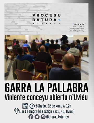"¡GARRA LA PALLABRA!" Llamáu públicu a participar nel próximu conceyu abiertu del #ProcesuBatura esti sábadu 22 de xunu
