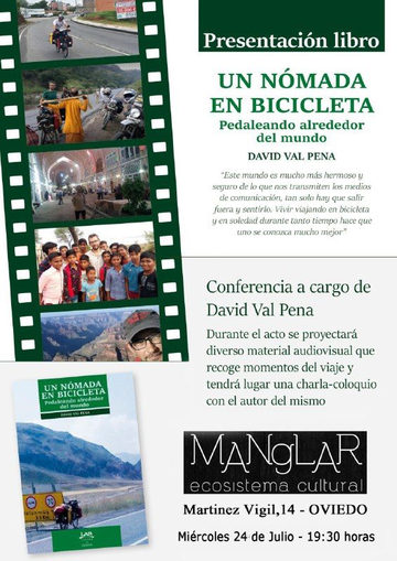 El relato pormenorizado de lo que le sucedió en su viaje de cuatrocientos días a través de veinte países, ilustrado con fotografías de cada lugar por el que rodó y gráficos de las etapas, es lo que cuenta minuciosamente en su libro Un nómada en bicicleta. Pedaleando alrededor del mundo, (LAR Libros. Serie Vivencias. Viveiro 2018) y de lo que hablará en su presentación, que tendrá lugar en Xxxxxx el próximo día xx de noviembre.