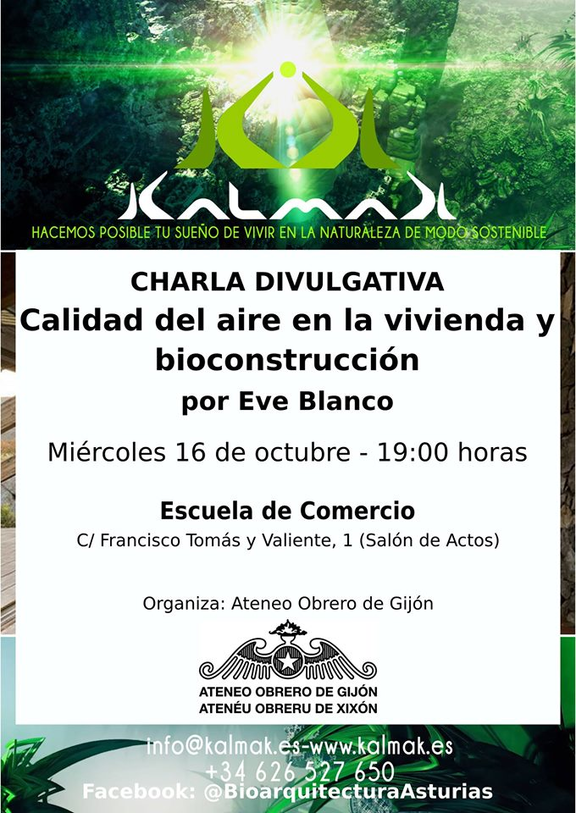El miercoles, día 16, a las 19h, en el Salón de La Escuela de comercio (C/ Francisco tomás y Valiente nº 1, Gijón), tendrá lugar una charla bajo el título Calidad del aire en la vivienda y bioconsrucción, a cargo de Eve Blanco, arquitecta escecializada en construcción sostenible. Este acto está organizado por el Ateneo Obrero de Gijón