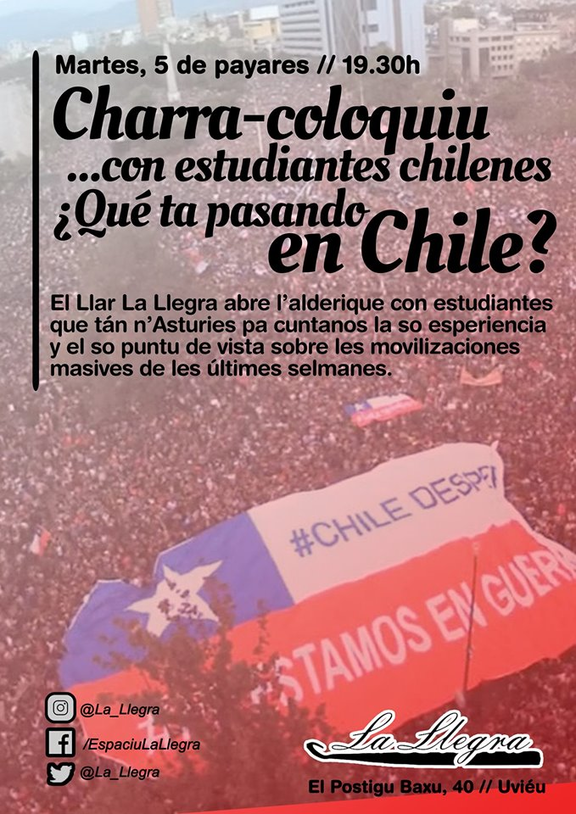Nestos díes, cuntamos cola presencia de delles estudiantes chilenes que tán n'Asturies y que yá desendolcaron dalguna movilización n'Uviéu pa denunciar lo que ta pasando, polo que tenemos la suerte de facer esti coloquiu-alcuentru pa falar de la situación del so país y analizar estos caberos 30 años de "democracia" y "constitución" que, como nos recuerden, foi fecha embaxo d'una dictadura militar. ¡Cuántu paralelismu!
