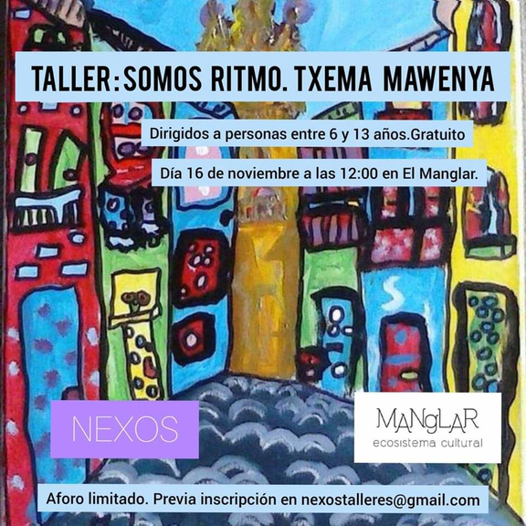 Somos Ritmo es un taller práctico y divertido para niñ@s de 6 a 13 años y/o familias. Este taller ofrece una mirada general a lo que es el ritmo, desde su origen vital a su utilización para el desarrollo emocional, creativo, social, cultural y económico del mundo; y las distintas maneras de generarlo creativa y musicalmente (instrumentos, percusión corporal, elementos de la naturaleza y material reciclado. Lo impartirá el músico Txema Mawenya, y es gratuito previa Inscripción en nexostalleres@gmail.com. Plazas limitadas.