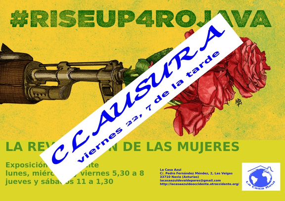 Retiramos del La Casa Azul la exposición "La Revolución de las mujeres". Nos despedimos con tristeza, conscientes del peligro por el que pasan. Aprovecharemos la clausura para hablar de Rojava, de las mujeres que no cesan en su revolución, recibiendo noticias a través de diversos vídeos.