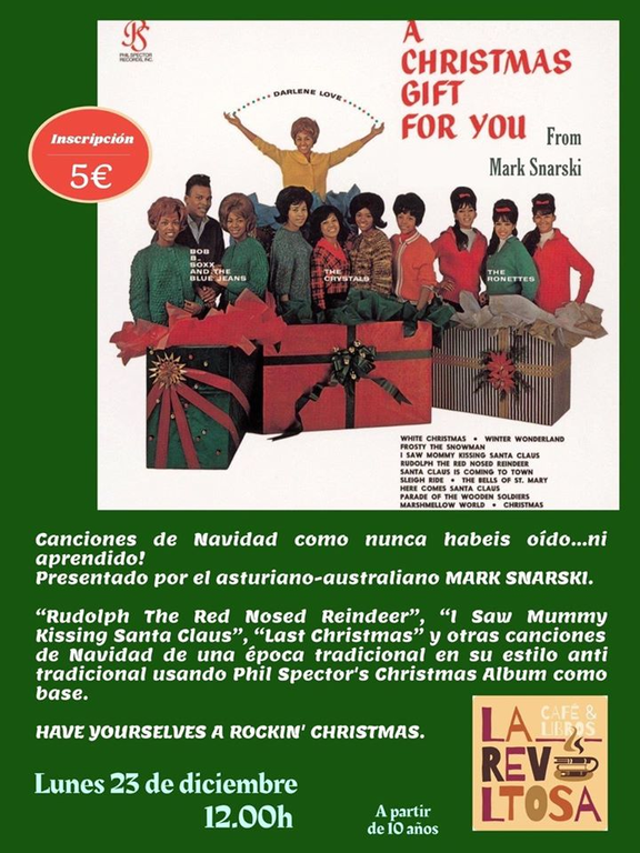 Canciones de Navidad como nunca habéis oído... ni aprendido. Porque no sólo se trata de escuchar, sino de aprender. Se ofrecerá en modo taller a. Y se trabajará con canciones como "Rudolph the red nosed reindeer", "I saw mummy kissing Santa Claus", "Last Christmas" y otras canciones de Navidad de una época tradicional en su estilo anti tradicional usando Phil Spector´s Christmas Álbum como base.