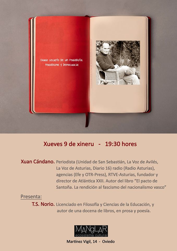 Será presentado por el escritor T.S.Norio, seudónimo literario de Braulio García Noriega (Oviedo, 1959). Licenciado en Salamanca en Filosofía y Ciencias de la Educación, T.S.Norio es autor de una docena de libros, en prosa y poesía. Está a punto de editar uno sobre Napoleón.