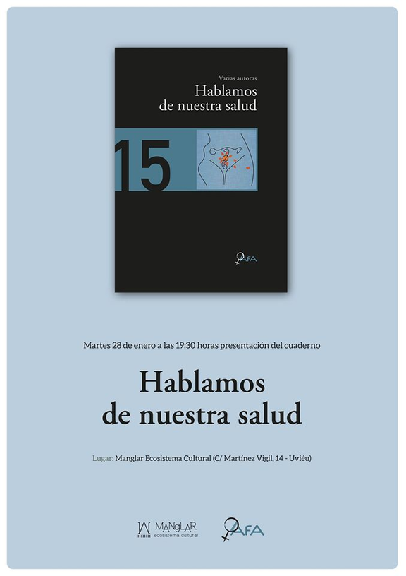 El próximo martes, día 28 de enero a las 19.30h, en el Manglar-ecosistema cultural, AFA os invita a la presentación del Cartafueyo Feminista nº 15 "Hablamos de nuestra salud". En él recogemos las charlas realizadas a lo largo del último año y en las que hemos abordado el VPH y su vacuna, la endometriosis, el parto intervenido y la percepción de la salud de las mujeres en Asturias. En el acto participarán algunas de las ponentes y habrá coloquio.