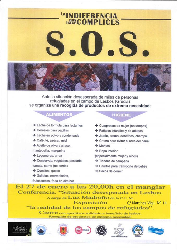 Campaña de información sobre la situación de emergencia humanitaria de refugiados y refugiadas en los campos de Lesbos (Grecia). Recogida de ayuda humanitaria.