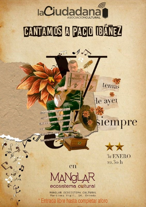 Homenaje a Paco Ibáñez, cantor de la resistencia y de la libertad y difusor de la poesía como arma cargada de futuro, que estará actuando en Gijón al día siguiente. Nos juntamos y cantamos las canciones de ahora y de siempre, con los mejores poetas hispanos de todos los tiempos: Góngora, Quevedo, Alberti, Neruda, Lorca, Machado, Nicolás Guillén, Goytisolo, Blas de Otero, Gloria Fuertes, Luis Cernuda, Celaya, Miguel Hernández, León Felipe,... Con Nacho Loy a la guitarra. Entrada tan libre como la voz de Paco Ibáñez (eso sí, hasta completar aforo).