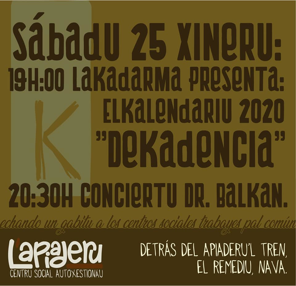 Esti sábadu la Banda de Gaites LaKadarma presentamos #ElKalendariu2020 #DeKadencia en CSA L'Apiaderu en El Remediu.