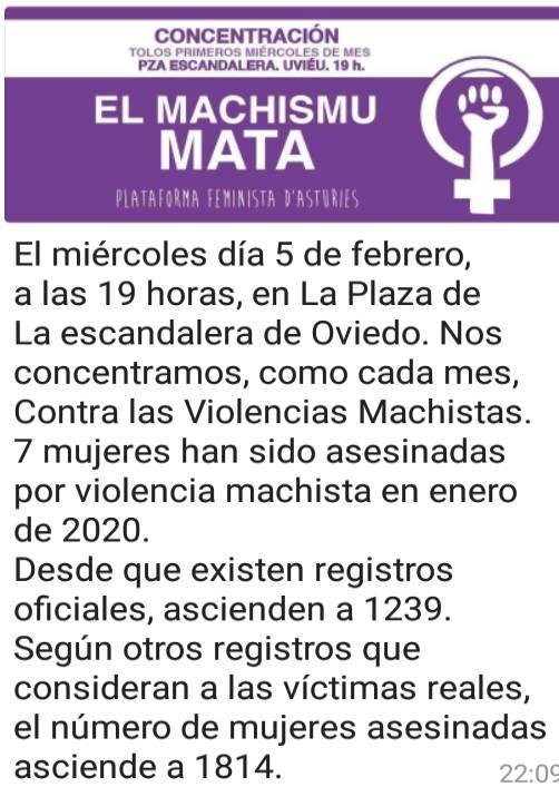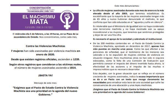 Próximo miércoles dia 5 de efebrero nos concentraremos a las 19.h en la Plaza de la Escandalera para exigir que se cumplan las medida contempladas en el Pacto de Estado contra las Violencias Machistas.