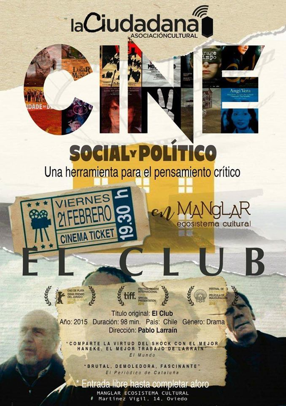 El chileno Pablo Larraín prosigue con su exploración de las miserias políticas, ideológicas y sociales de su país. Tras analizar la dictadura de Pinochet en películas como Tony Manero, Post Morten y No, la emprende ahora con los abusos sexuales perpetrados por la clase eclesiástica. Mezcla de cine de guerrilla y relato fracturado, de panfleto y manifiesto, de rabia y furor, El club hace de la palabra (alocada, frenética, balbuciente, incoherente) y de los encuadres claustrofóbicos en espacios no especialmente reducidos, sus mejores armas expresivas. El club que da título al filme es una casa en las afueras de una ciudad costera en la que los responsables eclesiásticos tienen recluidos a cuatro sacerdotes pedófilos. La Iglesia enmascara, no afronta el verdadero problema. Esconde sus taras y lacras en una casa vigilada por una mujer cuyo carácter también pende de un pasado traumático,... Entrada libre hasta completar aforo.