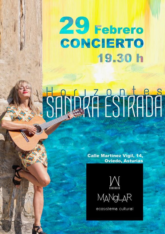 Sandra Estrada presenta "Horizontes", su primer disco, en El Manglar. Un proyecto musical que surge de la sinceridad y espontaneidad de los sentimientos. Once temas, a caballo de estilos pop, jazz o reggae, que se enlazan para formar un disco de fusión y análisis realista de la condición humana. Un canto en busca de la belleza y el placer, con el amor como bandera. Un canto a lo imposible hecho realidad, para tornar la pena en alegría. Un producto artesanal muy pero que muy bien facturado.