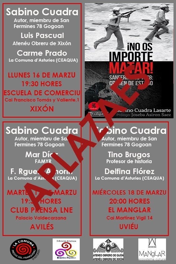 Por motivos ayenos a la organización y por causa de les midíes preventives que se tán tomando pol #COVID19, suspéndense los actos de presentación del llibru de Sabino Cuadra "No os importe matar".