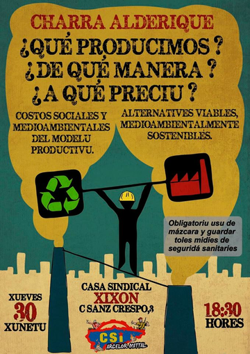 ¿Cómo confrontamos dende'l sindicalismu la supervivencia de la industria cola imperiosa necesidá pa sobrevivir de curiar el entornu natural nel que vivimos? Sabemos que munches formes de producción van desapaecer, ye inevitable. ¿Apaecerán otres nueves? ¿Será posible meyorar l'actual situación con un meyor repartu del emplegu? ¿O nun queda otra que resignase?