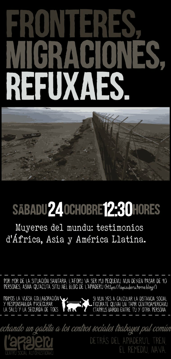 Esti sábadu 24 tenemos otra charla del ciclu Fronteres, Migraciones, Refuxaes y vamos contar col testimoniu de muyeres d'África, Asia y América Latina sobre les sos esperiencies migratories![]()