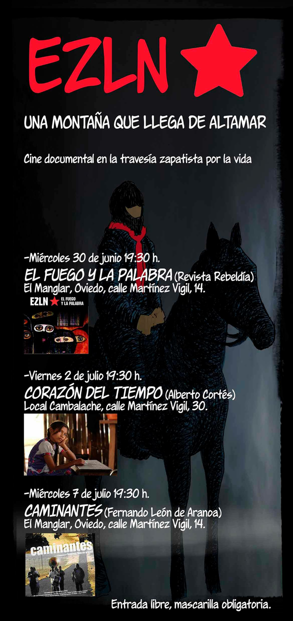 Tras 50 días de travesía marítima cruzando el Océano Atlántico, una delegación del EZLN acaba de arribar a las costas gallegas, desde México, en gira por Europa. Una de las escalas será, probablemente, Asturies. Así que, para celebra, recordar y calentar motores, organizamos este ciclo de cine zapatista que, quizás, cuente con algún comentarista inesperado,... Entrada libre con medidas de aforo según normativa COVID. Uso obligatorio de mascarilla, paliacate y/o pasamontañas.