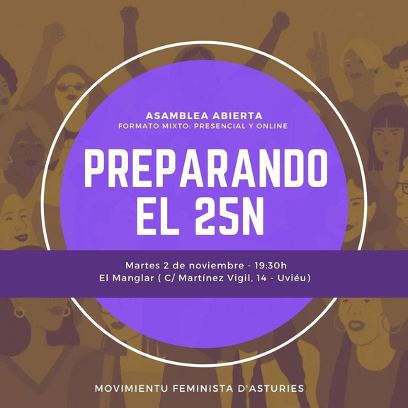 Tenemos el #25N a la vuelta de la esquina y mucho que preparar. Ven a la asamblea presencial y, si no puedes, a la asamblea virtual, mañana martes 2 de noviembre a las 19.30 en El Manglar, Oviedo.