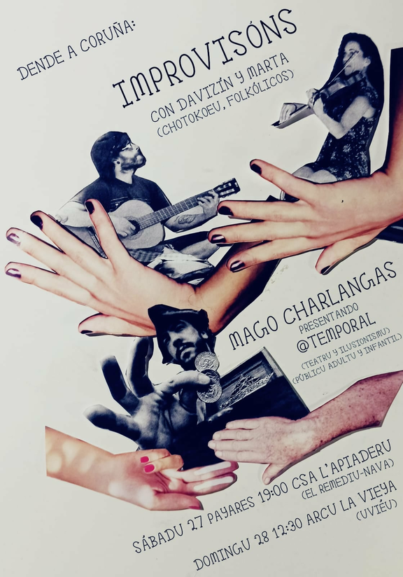 Improvisóns ye un espectáculu n'evolución constante, tan efímeru como cambiante, que nesta ocasión vendrá de les manes de los coruñeses de Daviz y Martiña, conocíos por grupos como Folkólicos o Chotokoeu. Cantares sacaos con tinu sobre la marcha al traviés del xuegu y la collaboración del públicu.