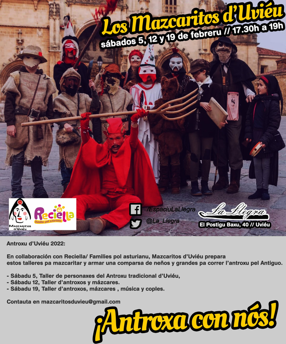 En collaboración con Reciella/ Families pol asturianu, Mazcaritos d'Uviéu prepara estos talleres pa mazcaritar y armar una comparsa de neños y grandes pa correr l'antroxu pel Antiguo.