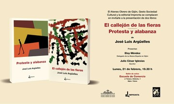 El próximo lunes, día 21 de febrero, a las 19H.30', en el Salón de Actos de la Escuela de Comercio (Cl Francisco Tomás y Valiente, 1), organizado por la Sociedad Cultural Gesto, el Ateneo Obrero de Gijón y la Editorial Impronta, tendrá lugar la presentación de los libros El callejón de las fieras y Protesta y alabanza, ambos de José Luis Argüelles.