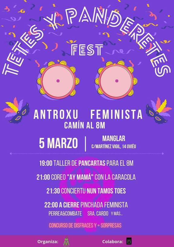 En el Manglar, calle Martínez Vigil, 14 Antroxu Feminista en Uvieu. Taller de pancartas, coreo "Ay mamá" con La Caracola y muchas sorpresas. Te esperamos el 5 de marzo a las 19h.
