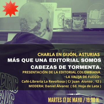 Al día siguiente, martes 17 a las 19:30, nos visita desde Colombia Marco Sosa, de la librería y editorial libertaria La Valija de Fuego. Conocimos a Marco hace unos años que tuvo a bien visitarnos, una bellísima persona con mucho que contar(nos). Le acompañará nuestro collaciu Dani A. Prendes, de Hoja de Lata Editorial.