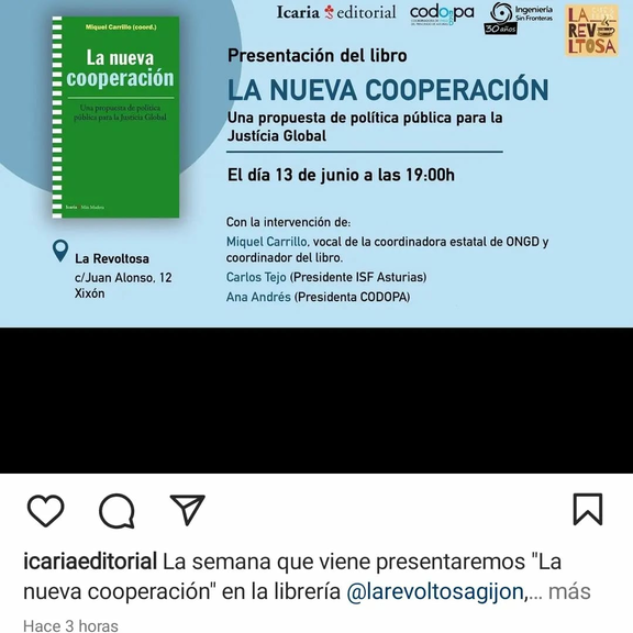 - L13, a las 19:30, presentación del libro "La nueva cooperación", de @icariaeditorial , estará el autor Miquel Carrillo, Carlos Tejo de @isf_asturias y Ana de Andrés de @codopa_asturias